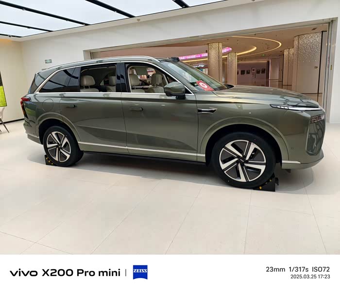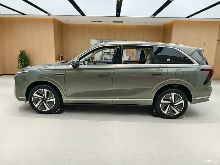 沧浪青车色配合方正的车身轮廓,既有新能源车的科技感,又不失传统SUV的硬朗气质。分体式大灯与贯穿尾灯形成“H”型家族设计语言,官方称灵感源自“Home”,实际观感确实给人一种家的安全感。车侧线条流畅,隐藏式门把手和21英寸轮毂进一步提升了高级感,唯一遗憾是车尾略显厚重,若能更灵动些会更讨喜。
