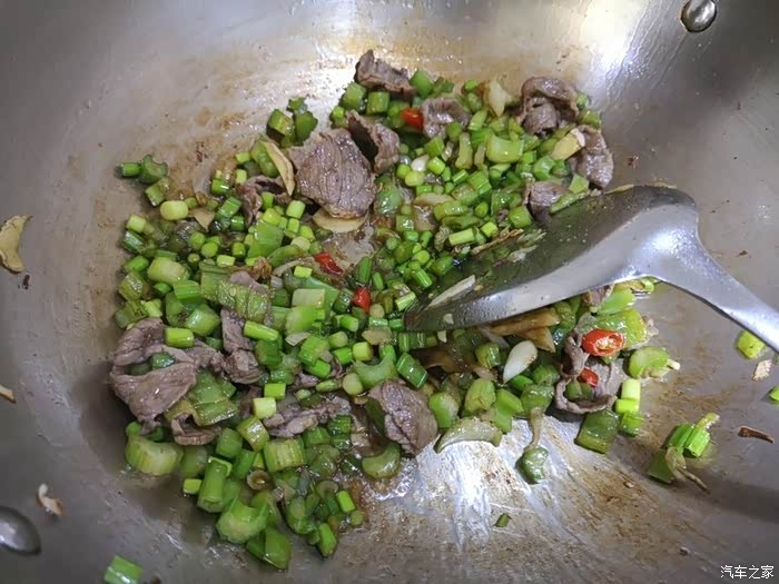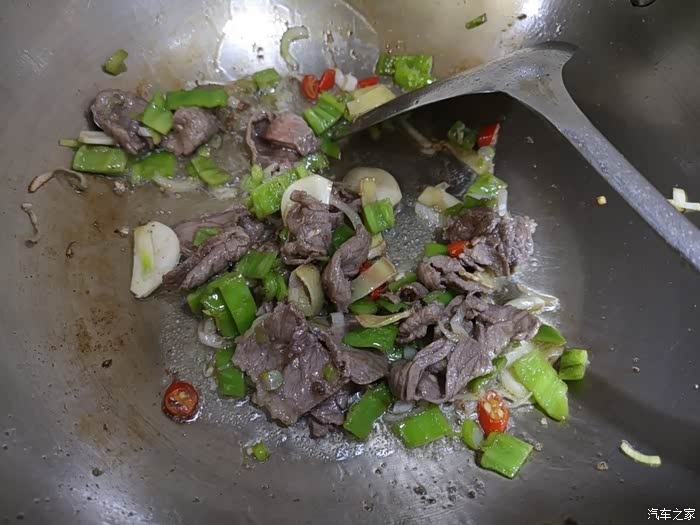 炒菜,正常炒菜的流程。油量比平时炒菜略多一点。 热锅凉油,油热放羊肉煸炒,变色,放葱姜蒜青红椒,一丢丢花椒粉,继续爆出香味。