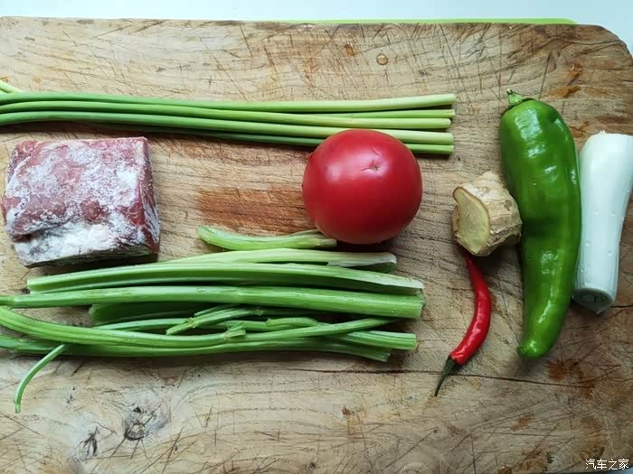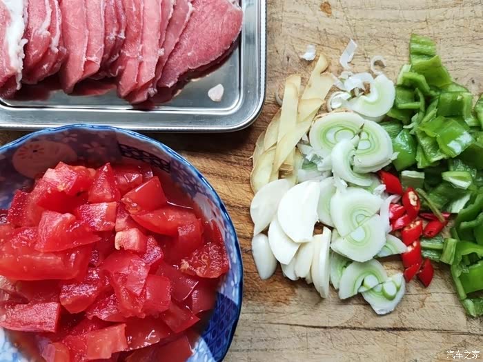 羊肉切片,西红柿青椒小米椒切丁,葱姜蒜切丝和片,备用。