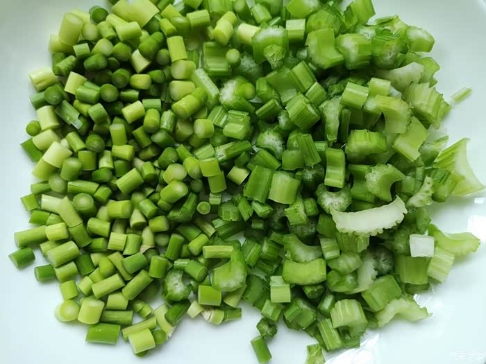 芹菜去掉老筋,切丁;蒜苔切丁。 炒面里一定要配蒜苔,又好吃又出味。