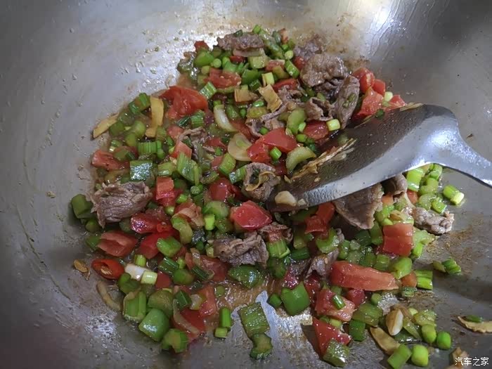 放西红柿丁,可以加一勺番茄酱,增加风味,继续煸炒至8分熟。