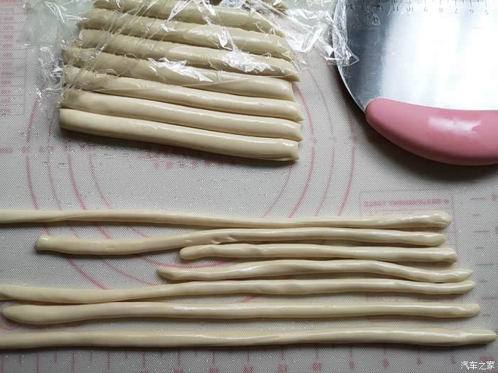 取一根面剂轻轻搓两下再拉长,醒透的面剂非常好拉。或是直接放在案板上搓长。 注意粗细均匀,比小拇指略细,依次搓好一半的面剂,排放整齐,中间不要粘连。