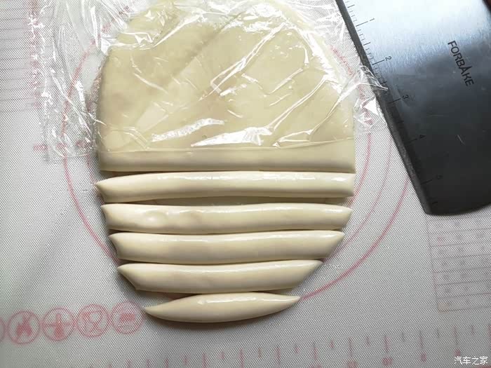 用刮板均匀的切成1cm的小节。 面剂上有油,不会粘在一起。