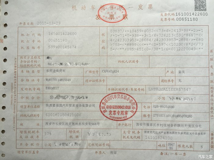 提车:看好了,OK!!!下车直接谈,之前电话里问过,1.5T舒适型说是也就1.6W左右的样子,我给她说能否2W,美女直接说这个优惠西安从来都没有,有的话也是综合优惠不是现金优惠,最后磨了半天,说到1.8W,她说去申请下,回来的时候说可以,我老爸又说你送个行李架吧,她最后勉强同意了。就这样,定金交了1000大洋,送的还有侧后膜、脚垫、后备箱垫、挡泥板,还有说是到时候贴上4S店的车贴帮宣传给送3次小保养!因为资金没到位,所以下周才提的车,下周去的时候发票又开不出来和保险单也没送过来,导致我周一又去了趟。提车出门不远加了320元的92,壳牌我一直信赖,上个车一直加壳牌,油耗刚开始17多,现在降到11多了,不敢狠踩。说说驾驶感受吧,因为磨合期,不敢急加速所以感受不出推背感,不过城市1.5够用了,方向还算精准,减震也不算太硬,隔音比较好,启停堵车一般都关了用着很不方便,视野很宽阔!因为在展厅里做进去的时候就感觉腿部比较局促,主驾和副驾都是,其实开开也就还好,新车味比较刺鼻,这个比较出乎意料。放图片吧!全程水果机 请见谅