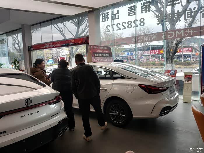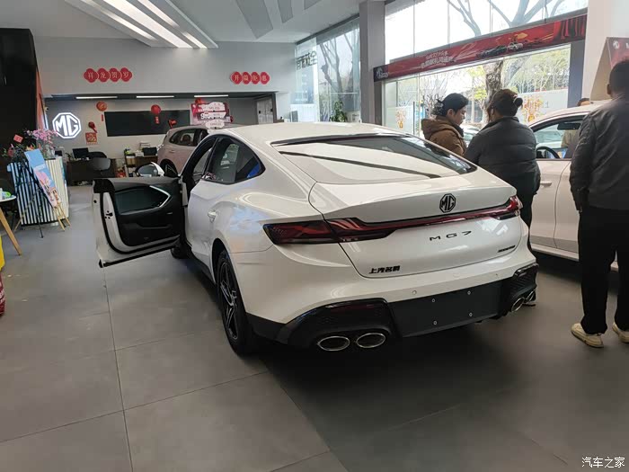 这就是我们今天要看的车型mg7,展厅这摆着的这台是白色的,1.5t豪华版。外观上看着还是蛮大气的,车身感觉比较长,销售顾问说这个车身将近4米9,B级车。而且还有无边框的车门,这个不错,挺好的。