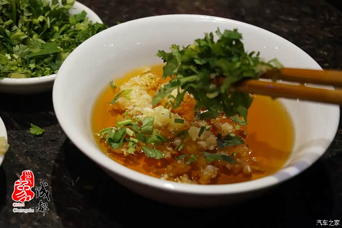 蘸料是一碗香油在里面加入香菜末和蒜末,均匀搅拌