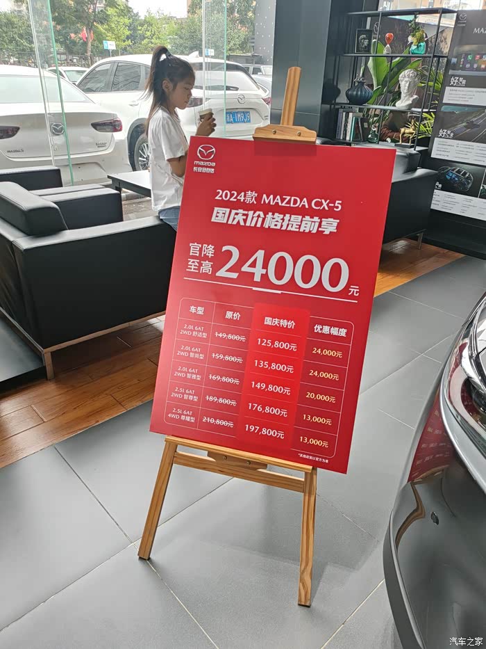 看了CX-30现车后和其它车比起来太小了,手动挡还是得定车,考虑在三最后选择了CX-5 2.0 智雅,赶上官降二万指导价149800优惠6000(就谈不下来了) 加旧车置换4000(本地问价没有一个店说有这个置换补贴),09年的小雅回收2400 ,送膜 脚垫 行车记录仪,就买了当天打临牌开回(当天旧车去置换新车开回),等4S旧车过户了自己在当地上牌,是不是像买白菜了?第一次买新车没经验看中就提了,旧车是摇到号也是跑大杭州二手市场买的