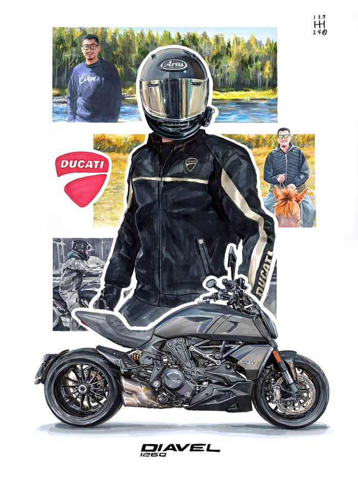 灵感往往来源于对生活的热爱和对美好事物的追求,绘画也是一样。前段时间有网友想给自己男友送一幅摩托车海报,这与我来说又是一次创作灵感爆发,马克笔手绘是一项对技巧和耐心要求极高的艺术形式,尤其这次的杜卡迪Diavel 1260,以其独特的设计风格和卓越的性能吸引了我。说干就干,绘画走起~
