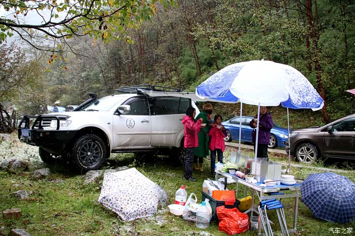 跟随志玲姐姐在二瓦槽右转进入莫斯卡的村道,继续前行了过了几公里,手机、GPS完全没信号了,反正就这一条路,接着开就是了。继续前行,开始下雪了,走到还有十公里的时候,有出来的车告知里面堵死了,进不去了。看来路一修好,莫斯卡这个山谷中隐秘的村落,如今也成了网红地了。此时雪越下越大,决定就地撑伞支桌埋锅造饭,先把午饭解决,到时再看情况。村道比较窄,找个宽阔可以错车的地方停车,锅碗瓢盆桌椅搬下车,大伞撑起来,小火锅造起来。