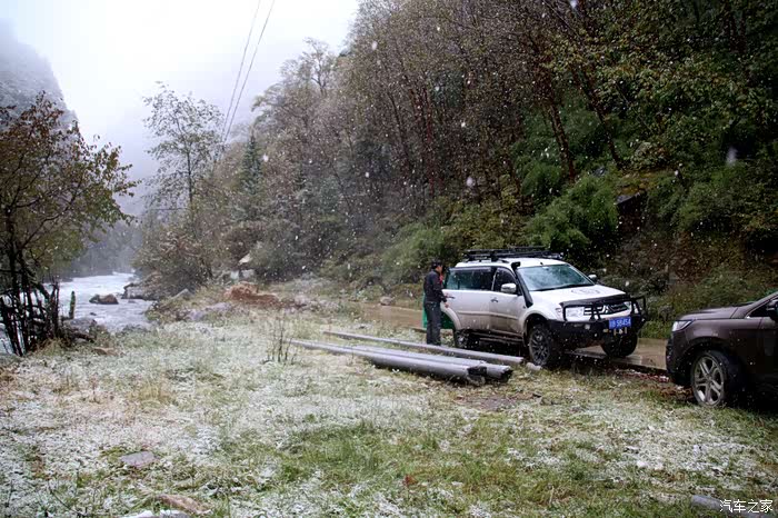 又一辆重庆车掉头回转停在这里,小崔也加入了我们。硬派越野,一脚油开进草地,车顶的雨棚支起来,完美。冰天雪地下,吃着火锅牦牛肉,最后还把火锅汤倒进去煮了一大锅面,简直人间美味。雪越来越大,这里成了一个临时的休息区,陆续有车停下来。