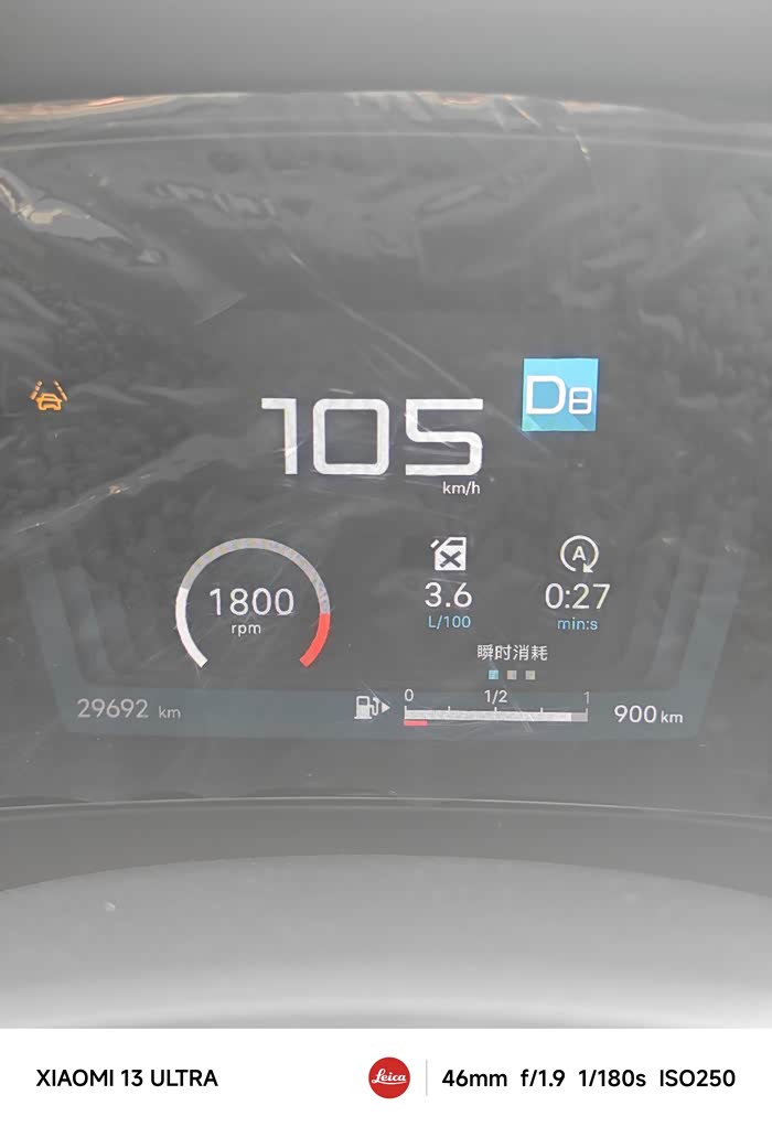 定速105的时速是最省油的,这个时候转速不达到2000,而且变速箱处于最高档位,也可以看到瞬时油耗是3.6