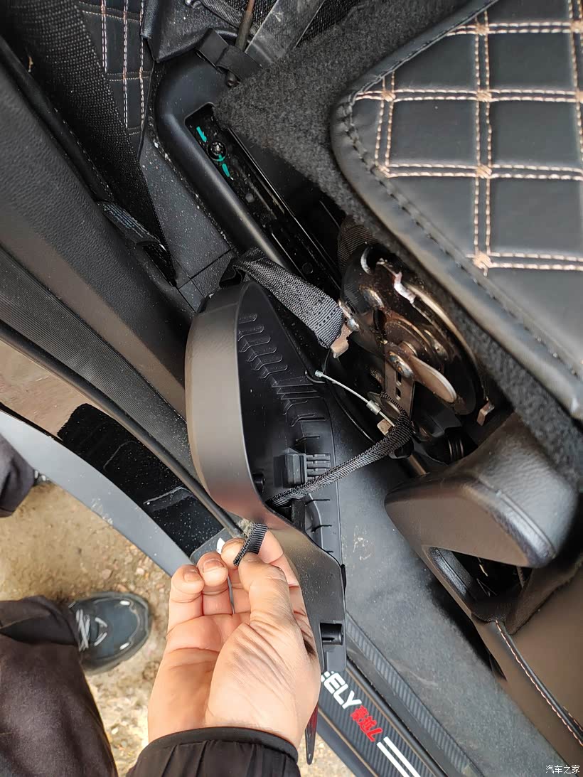 第6步,安装座椅两侧的装饰模块。整体切割到位之后,就需要把座椅两侧的这个装饰保护模块给重新装配回去,首先要把这个解锁拉手的的绳子给穿出来,这个是必须的。之后再按照卡扣固定到位,最后把螺丝拧上去就行了。