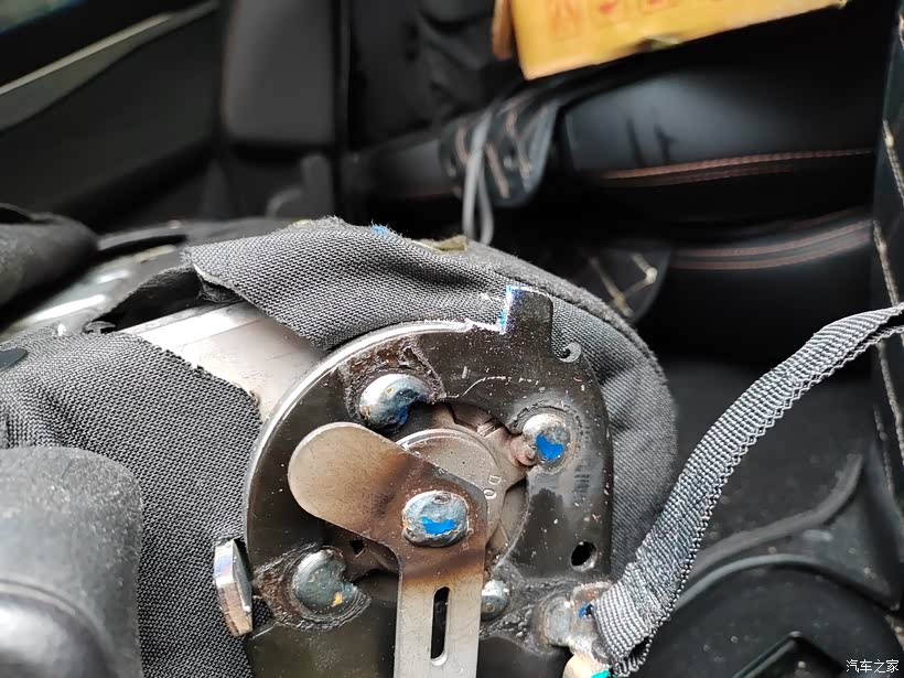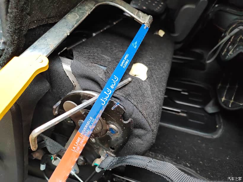 用尺量完之后,用记号笔在限位片上面做好标记之后开始切割就行了。由于自己操作,所以就使用的是手动的铁锯。将座椅放倒之后发现,这个后加的座椅套以及座椅后面的这个保护垫都是会影响到铁锯的空间,是需要进行拆卸的。