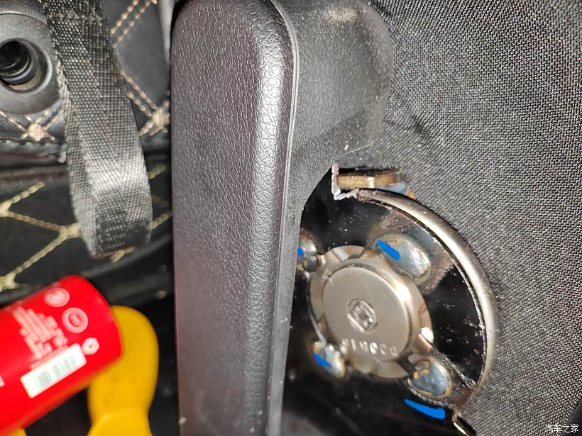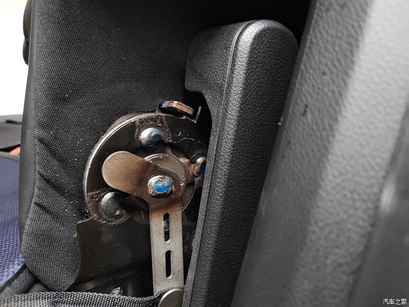 第2步,检查座椅靠背限位器的情况。把座椅两侧的装饰盖拆掉之后,就可以看到内部的限位器。通过研究可以看到这个限位器主要就是通过后面的凸起位置进行限位的。如果想要增大角度的话,只要是把凸起的这个铁片适当的给先后切割,那么就能够实现。而且通过测试发现这个座椅靠背的转轴,间隔着都是有限位锁扣的,所以说就算是增大座椅靠背的角度,那么也是能够实现限位的效果。