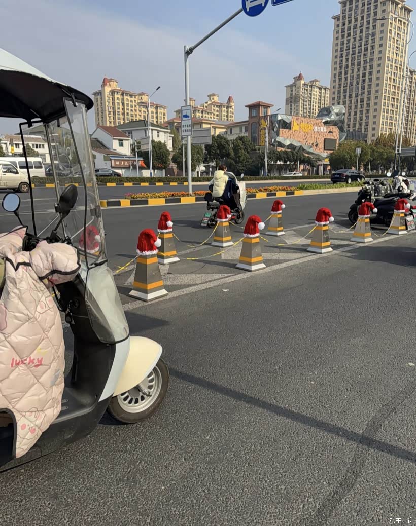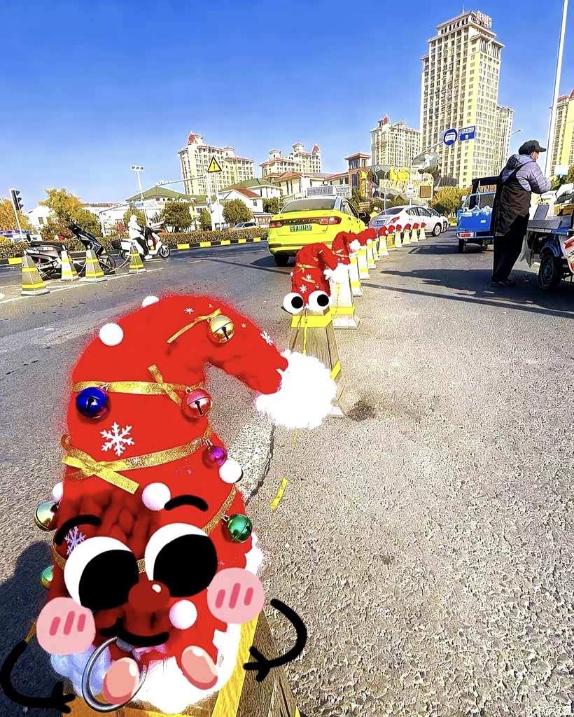 但是万万没想到的是!路边锥锥们也都戴了圣诞帽!而且明年是马年,好有意义~