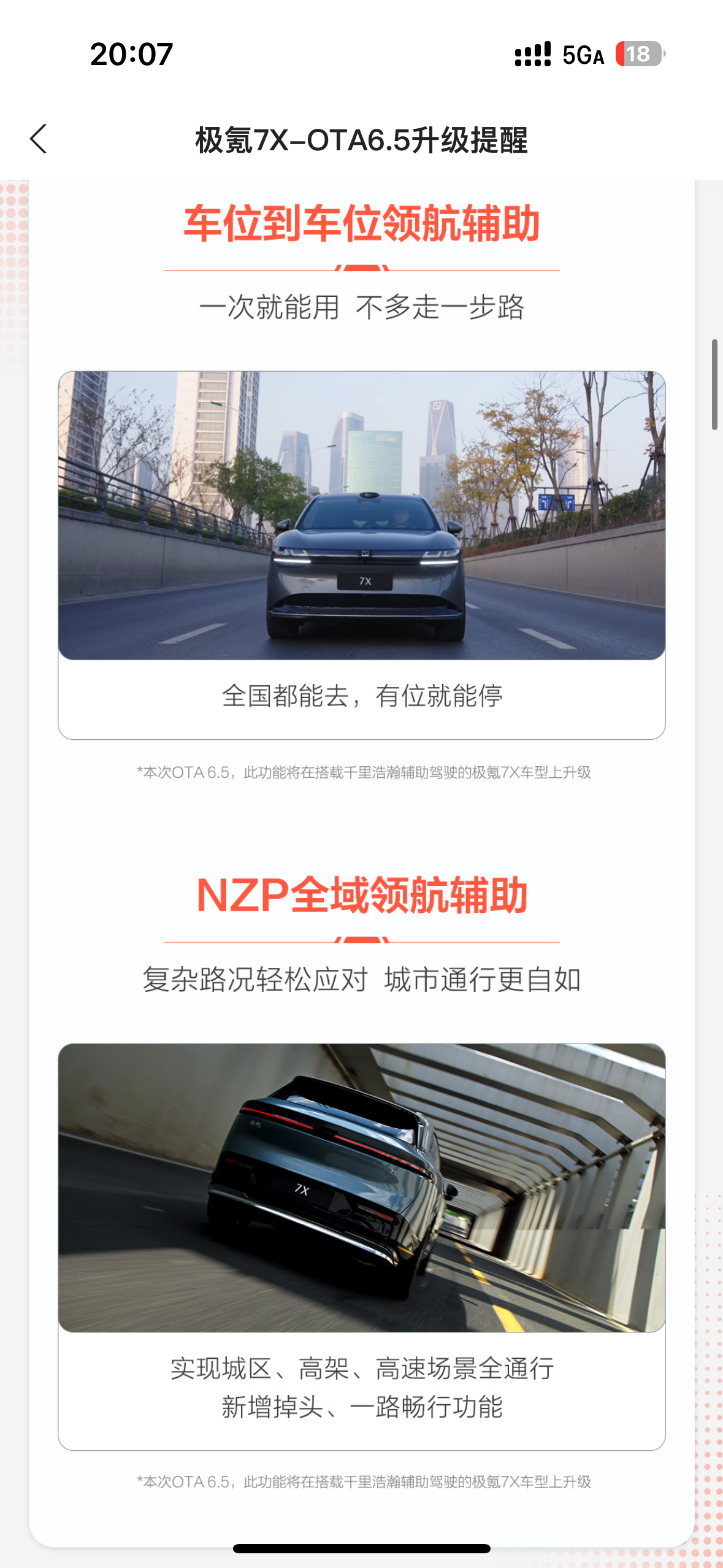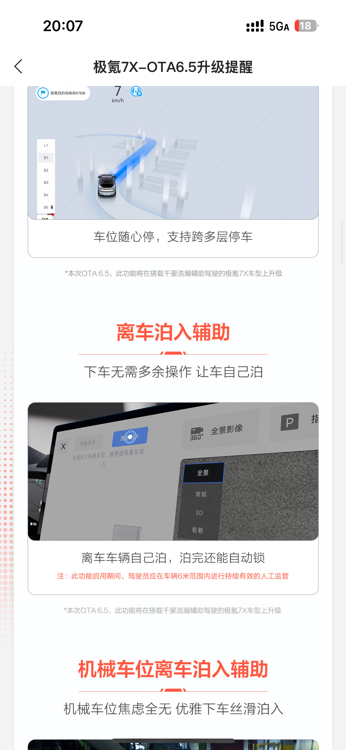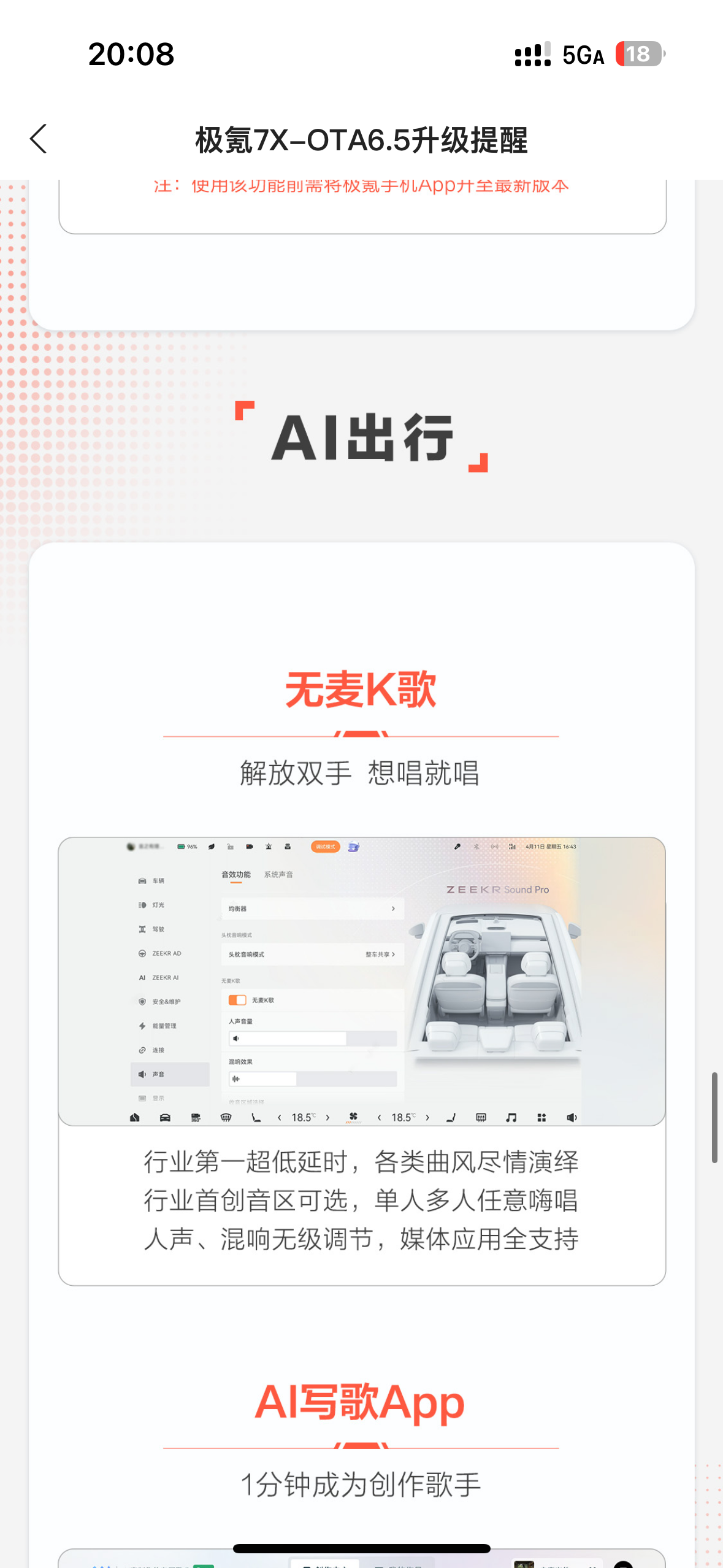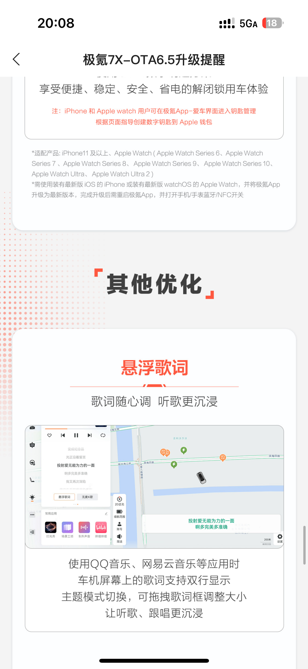 8月底极氪终于向我们75度丐版老韭菜推送了OTA6.5,对我来说主要三个点很实用。第一就是自动泊车更智能更快了,考虑时间少停车快,识别车位范围大。之前需要前后挪动的车位移动到一定位置后犹豫考虑时间比较长,6.5之后几乎是像老司机一样秒调整了,离车自动泊入也一样,稳定干脆,信心十足;二是播放音乐时候二排的歌词显示加上无麦k歌,车内休息时可以直接变练歌房,比起平时出钱去商场的迷你k歌房省钱又方便,在车里休息的时候多了一大消磨时间的利器,就是希望歌词可以更新透明背景就更完美了,平时也可以开着不违和;最后是对苹果用户来说更新了智能钥匙3.0,结合了蓝牙流量nfc的车辆解锁系统非常丝滑,从此以后上车再没有罚站过,传说即使手机没电了也可以启动车辆,真的实现了出门一部手机,裤兜毫无压力。智能驾驶方面我简单尝试了一段距离的路程,直线行驶似乎完全没问题了,堪比老司机,就是转弯和掉头,虽然也没什么大问题,但考虑时间还是相对多一些,比较犹豫,特别是后方有来车的时候距离比较远,过与等的博弈,仍然比较保守。此外看更新日志还增加了一些主动安全保护系统,特别是自动紧急转向,虽然没有使用过,也不希望在现实中用到,但极氪真的让我感受到安全是最大的豪华,对有安全底蕴的极氪信心满满。