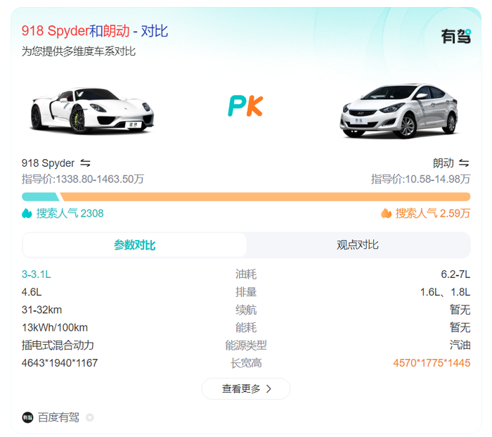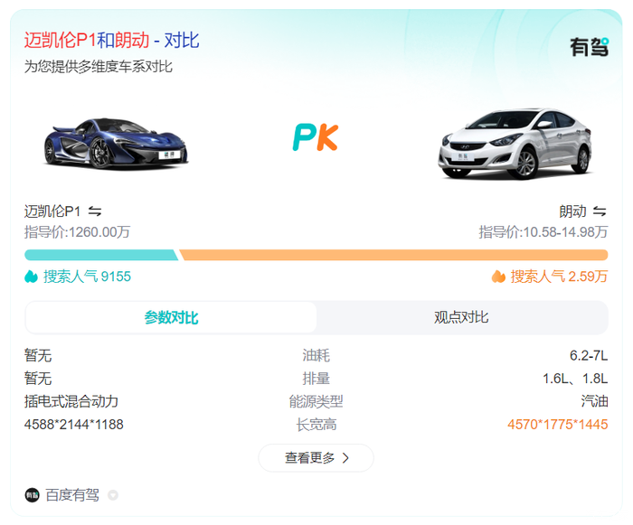 迈凯伦P1:这款高端跑车的指导价高达1260万,然而其搜索人气仅为9155,远不及朗动。