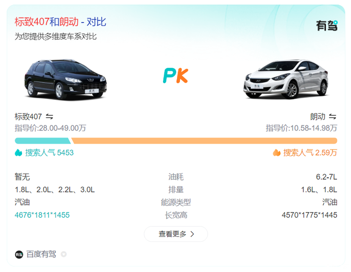 标致407:指导价范围为28.00万至49.00万,搜索人气为5453,也低于朗动。