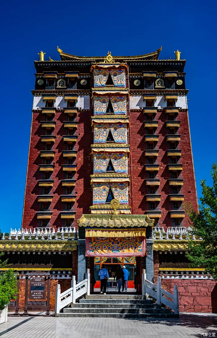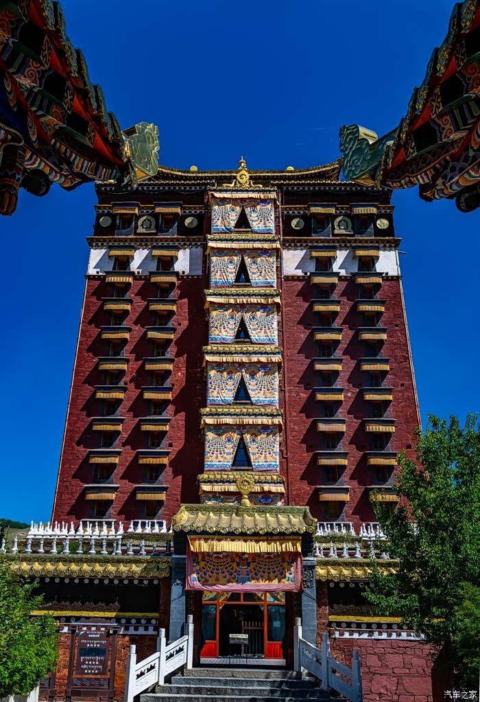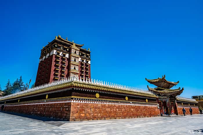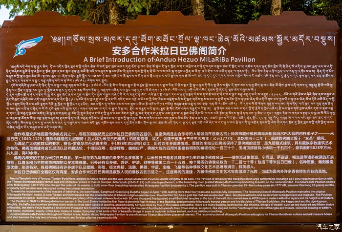 上午11点,途径米拉日巴佛阁。米拉日巴佛阁位于甘南合作市,它的全称是“安多合作米拉日巴九层佛阁”,名字虽然有点儿长,却也讲得很明白。始建于清乾隆四十二年(1777年),原建楼阁毁于“文革”。现有建筑重建于1988年5月,历时四年落成。米拉日巴佛阁是为纪念米拉日巴而修建的佛阁。是藏传佛教噶举派(白教)在安多藏区的代表寺院。楼高共九层,供奉以米拉日巴尊者及其弟子为主的藏传佛教各派的开宗祖师,有以金刚为主的四密乘的众多佛像、菩萨、护法神等各类佛像1720尊。表现了藏传佛教各类壁画规模之巨大,绘画技法之高超,具有很高的艺术价值。
