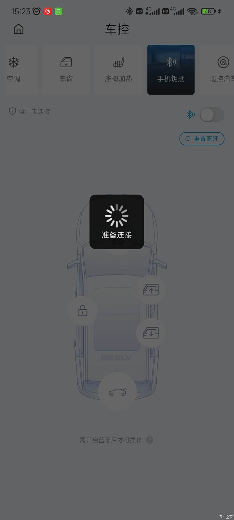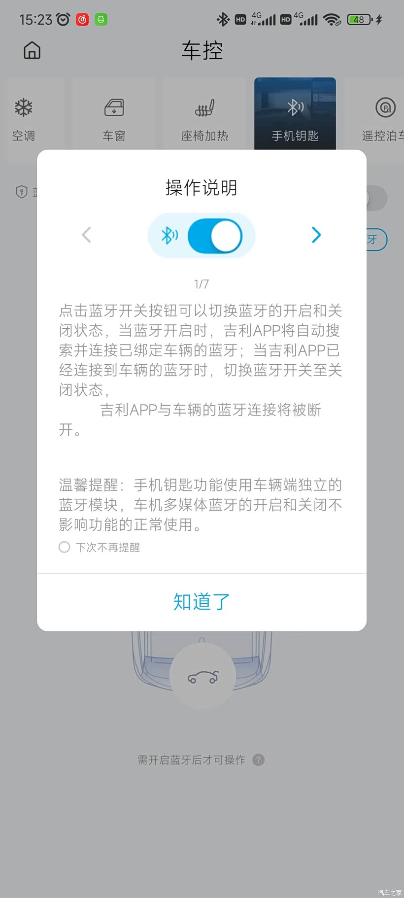 1、这个蓝牙钥匙,需要在车内才能完成连接