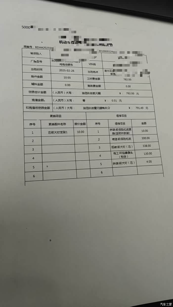 4s店这边给我看了定损单,维修项目列了5项,有拆装(前保险杠皮)、喷漆(前保险杠皮)、低碳(前大灯)、电工(环视摄像头)、拆装(前大灯),总共是792元。定损清单看下来,连拆装和检查都是要收费的。