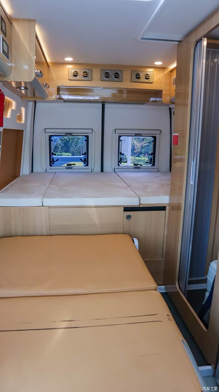 后置横床+隐藏储物:车尾1.85×1.2m横床满足双人睡眠,床底贯通式储物舱可容纳4个24寸行李箱;