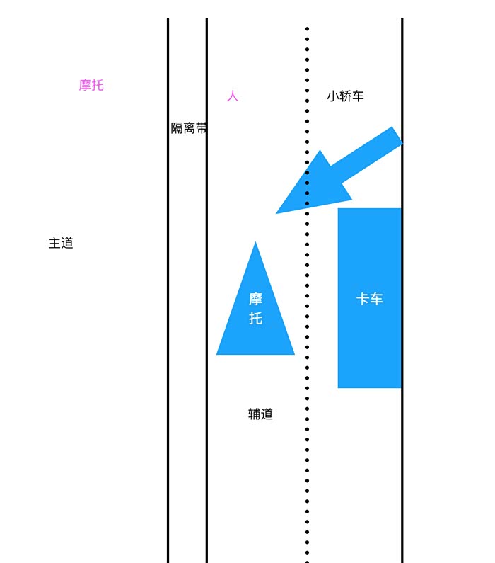先上个示意图,小轿车鬼探头+逆行,我骑着摩托,估计以60左右的速度直接撞到对方车头,人飞起来,摩托车越过隔离带,摔落在主干道上。