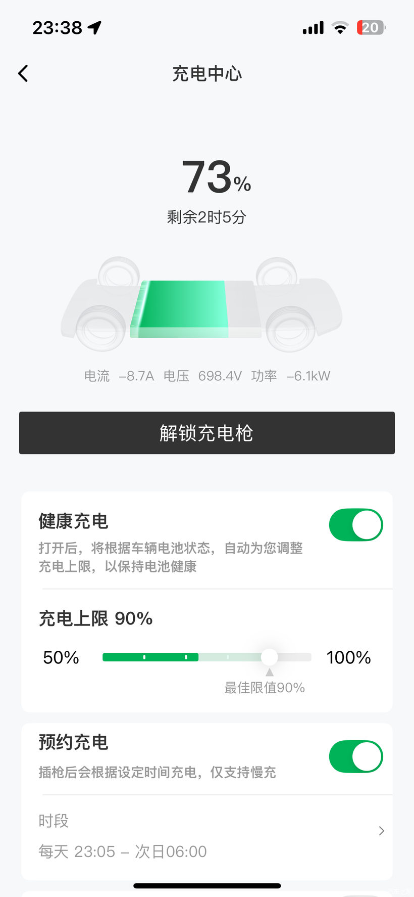 正常现象,C10是800V平台的车,慢充时电压显示698V是系统根据电池状态自动调节的。电流负值表示充电状态,家里300V的车是400V平台的。安心充就行,这车有健康充电管理不会过充。