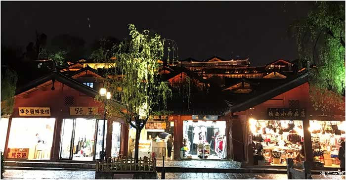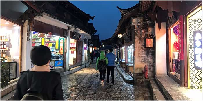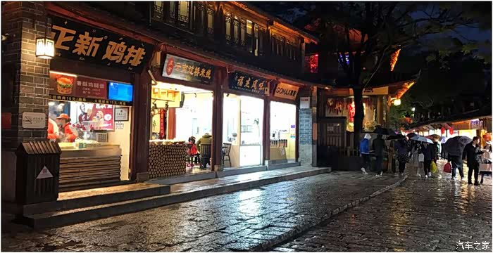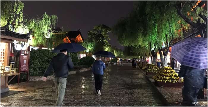 因为有点小累了,先在客栈眯了一会,晚上7点才出来古城找吃的,此时已经由中雨转小雨,我们撑着伞就出门了。此时气温只有5度。