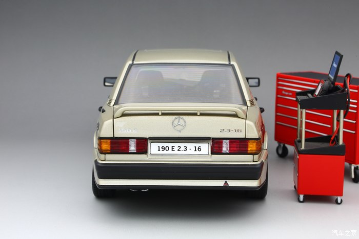 1984年法兰克福车展中,奔驰推出了一款名为190 E 2.3-16的运动版车型。与190E相比,190 E 2.3-16采用了全新设计的运动型车身套件,前后保险杠整体性更强,取消了车门塑料防擦条后,侧裙的应用令整车视觉重心更低,车尾最抢眼的莫过于后扰流板和“2.3-16”的身份标识。内饰方面,190 E 2.3-16采用包裹性更强的真皮+织物运动座椅,中控台下方的储物格面积缩小后,包括油温和油压表在内的三块仪表被放置在音响面板下方,用以营造190 E 2.3-16车内的运动化氛围。 奔驰190 E 2.3-16代号M102E23/2的发动机基于奔驰230 E的2.3升发动机改进而来,经过调校后,这台2.3升直列四缸16气门发动机最大功率达到了185马力(136kW)/6200rpm,最大扭矩235N·m/4500rpm,配备5速手动变速箱和4速自动变速箱,其0-100km/h加速时间7.2秒,最高时速234km/h。(来自网络)