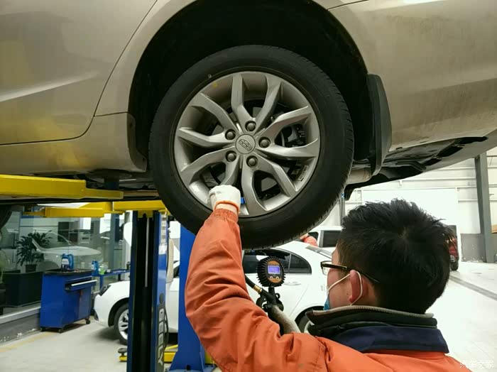 测量胎压。胎压过高、过低都不利于安全驾驶,猴子冬天一般保持胎压在2.5个,帝豪GL的车门位置有具体的胎压标准标识,车友们可以参考。