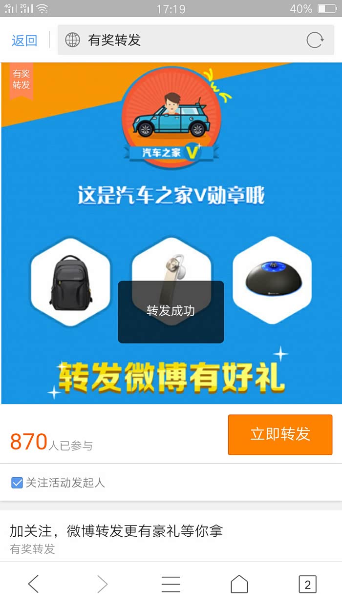 号外!号外!汽车之家又出新勋章啦!!!这次是汽车之家微博专属勋章哦,只要你关注了汽车之家在新浪的官方微博,截下“相互关注”的图片,就可以获得此勋章哦。是不是很简单,那就快来参加吧!另外,去汽车之家新浪微博上面转发微博,就有机会获得磨光球的车载净化器,或者是新秀丽书包,还有蓝牙耳机哦。 只要动动手指就有机会获奖哦。【参与活动时间】2016年7月11日-2016年8月8日23:59:59【参与方法】一.赢专属勋章方法:第一步:扫秒下图中的二维码,登录您的新浪微博账号,找到汽车之家官方微博账号,点击“加关注”就完成第一步啦~第二步:当您“已关注”后,用截屏的方式将图片直接回复到此帖楼层下,即可完成第...