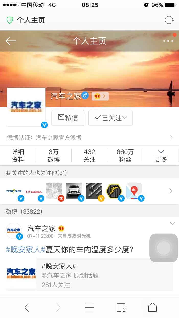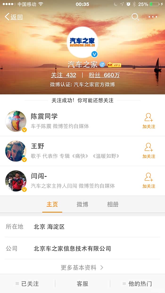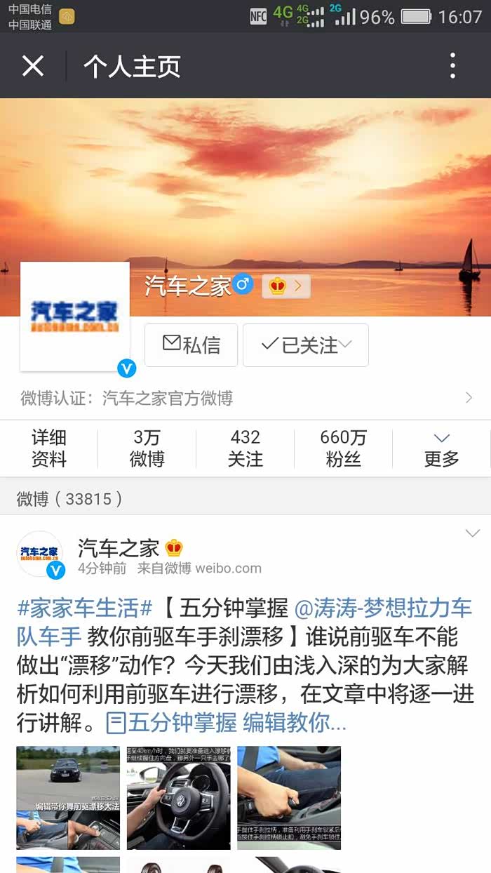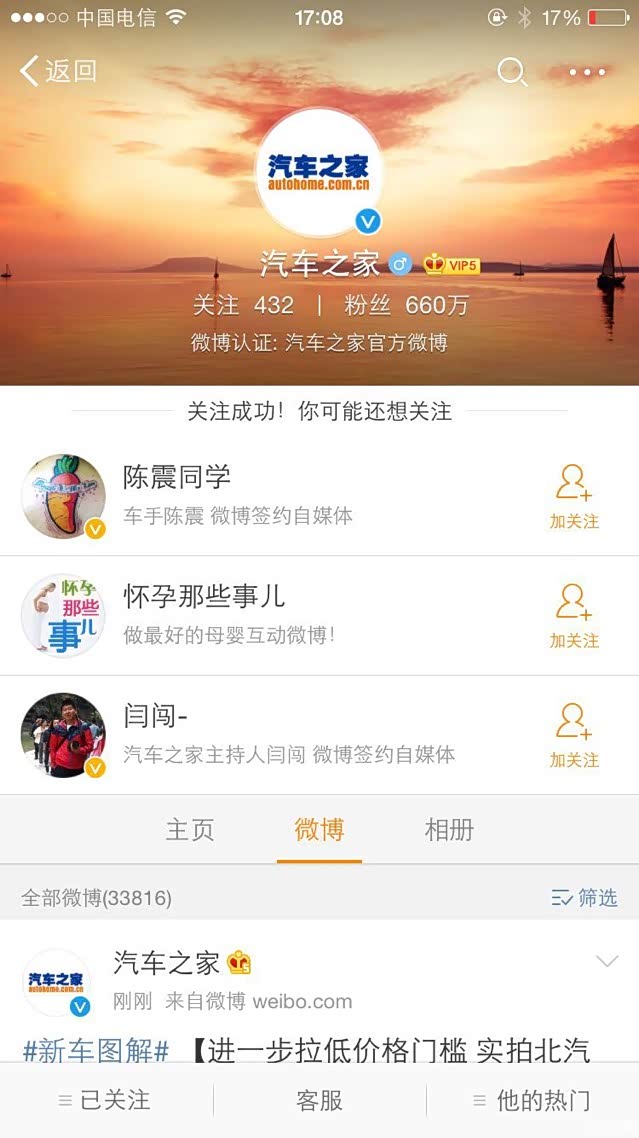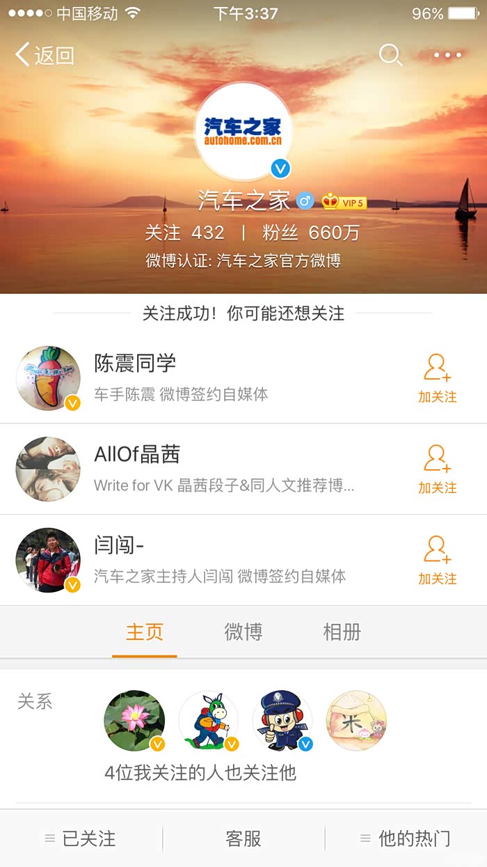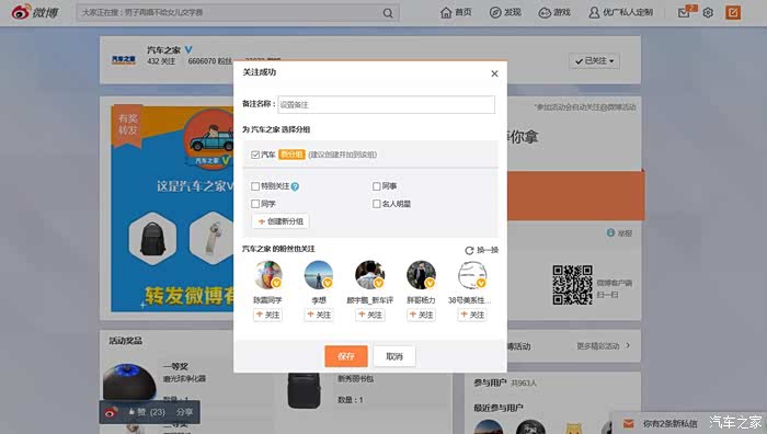 第一步:扫秒下图中的二维码,登录您的新浪微博账号,找到汽车之家官方微博账号,点击“加关注”就完成第一步啦~