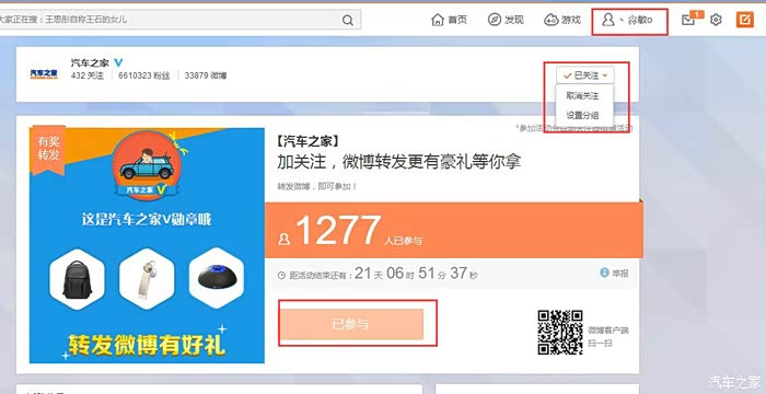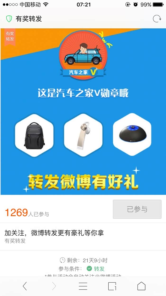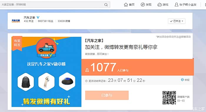 号外!号外!汽车之家又出新勋章啦!!!这次是汽车之家微博专属勋章哦,只要你关注了汽车之家在新浪的官方微博,截下“相互关注”的图片,就可以获得此勋章哦。是不是很简单,那就快来参加吧!另外,去汽车之家新浪微博上面转发微博,就有机会获得磨光球的车载净化器,或者是新秀丽书包,还有蓝牙耳机哦。 只要动动手指就有机会获奖哦。【参与活动时间】2016年7月11日-2016年8月8日23:59:59【参与方法】一.赢专属勋章方法:第一步:扫描下图中的二维码,登录您的新浪微博账号,找到汽车之家官方微博账号,点击“加关注”就完成第一步啦~第二步:当您“已关注”后,用截屏的方式将图片直接回复到此帖楼层下,即可完成第...
