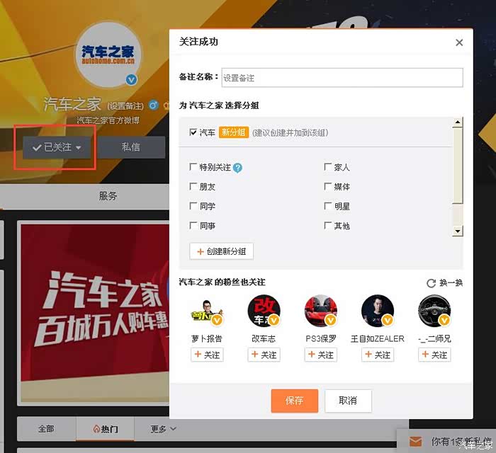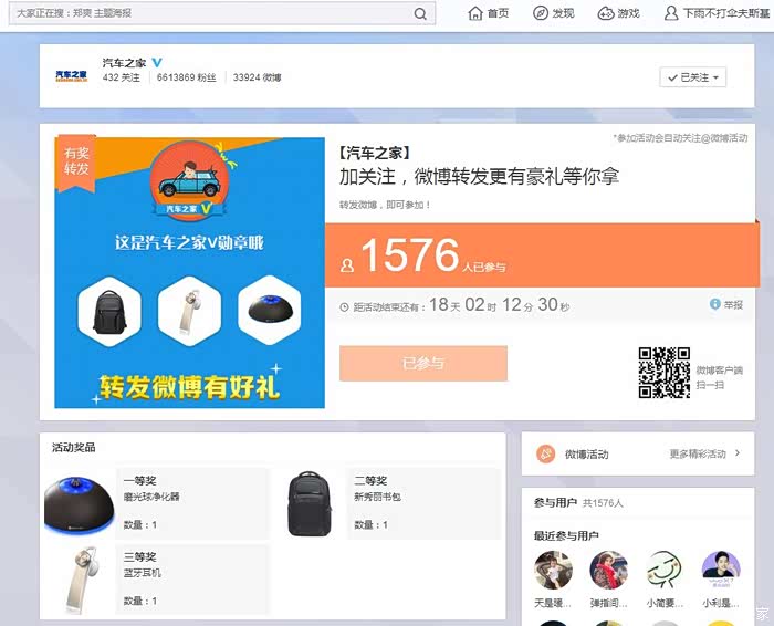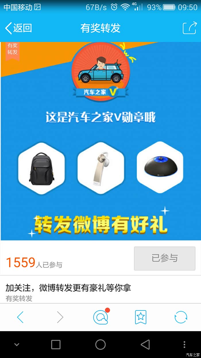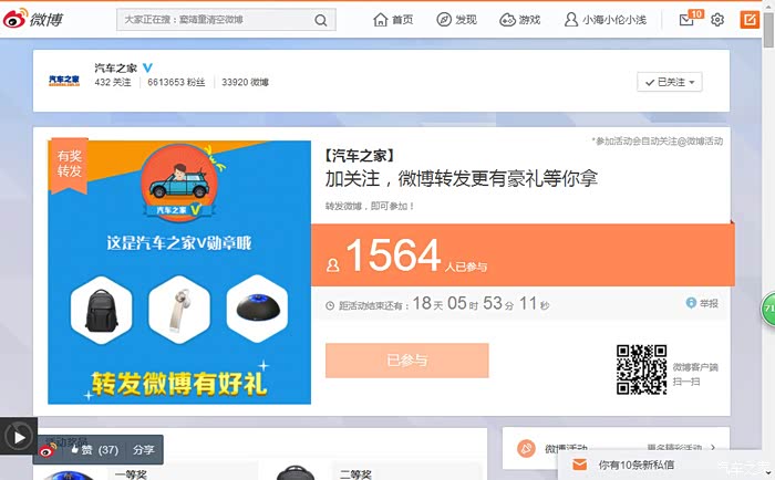 号外!号外!汽车之家又出新勋章啦!!!这次是汽车之家微博专属勋章哦,只要你关注了汽车之家在新浪的官方微博,截下“相互关注”的图片,就可以获得此勋章哦。是不是很简单,那就快来参加吧!另外,去汽车之家新浪微博上面转发微博,就有机会获得磨光球的车载净化器,或者是新秀丽书包,还有蓝牙耳机哦。 只要动动手指就有机会获奖哦。【参与活动时间】2016年7月11日-2016年8月8日23:59:59【参与方法】一.赢专属勋章方法:第一步:扫描下图中的二维码,登录您的新浪微博账号,找到汽车之家官方微博账号,点击“加关注”就完成第一步啦~第二步:当您“已关注”后,用截屏的方式将图片直接回复到此帖楼层下,即可完成第...