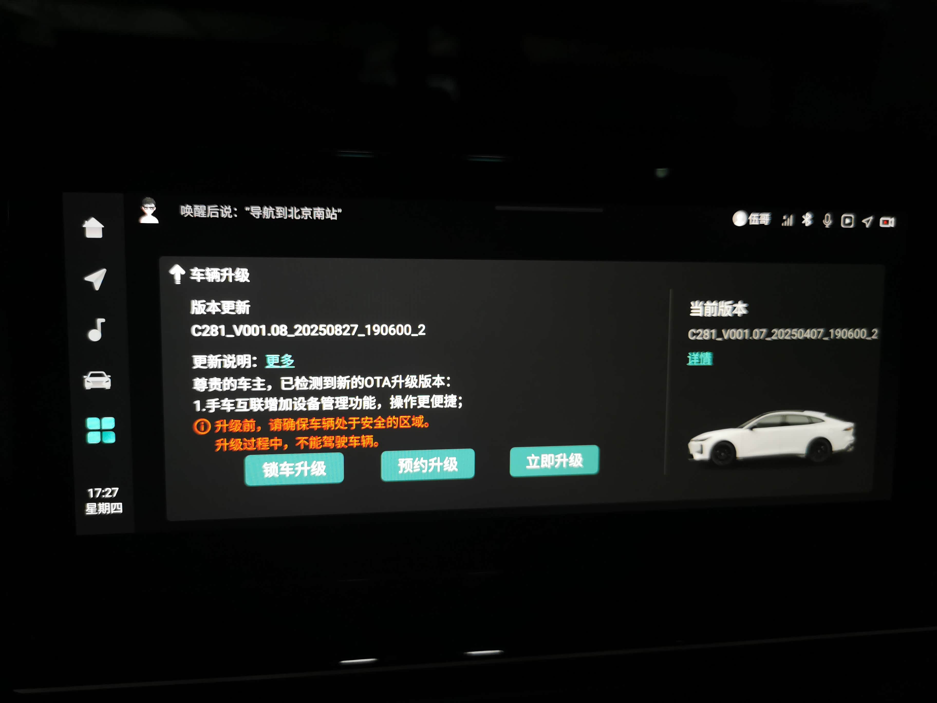 升级方式有三种,锁车升级、预约升级、立即升级。我选了锁车升级,系统提示锁车后自动装,因为有点饿我就没有坐车里等着它升级了。有同样开UNI-V的车友们赶紧去看看你们的车有没有收到升级提示,升级完体验一下优化后的功能特别好用。
