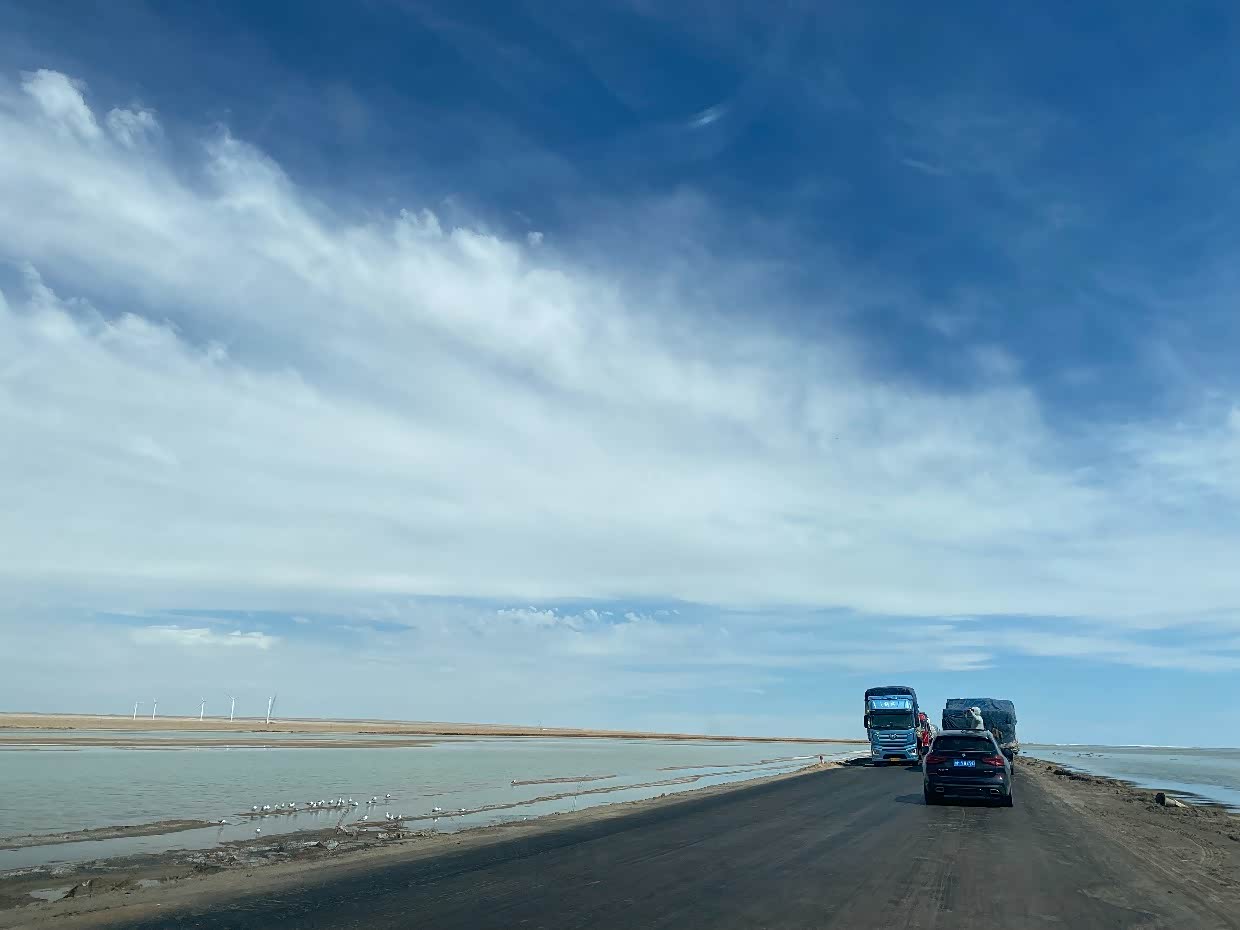 从水上雅丹出来,很多游客就往回走了,其实再往西41公里,就是西台吉乃尔湖,这才是一个真正拼人品的地方,因为现在水少了,货车师傅说一年就7,8月的丰水期能看到,但是基本很多时候都看不到双色,爱拼才会赢,大不了就是来回多开2个小时车 ,走~~~~~~~~~~