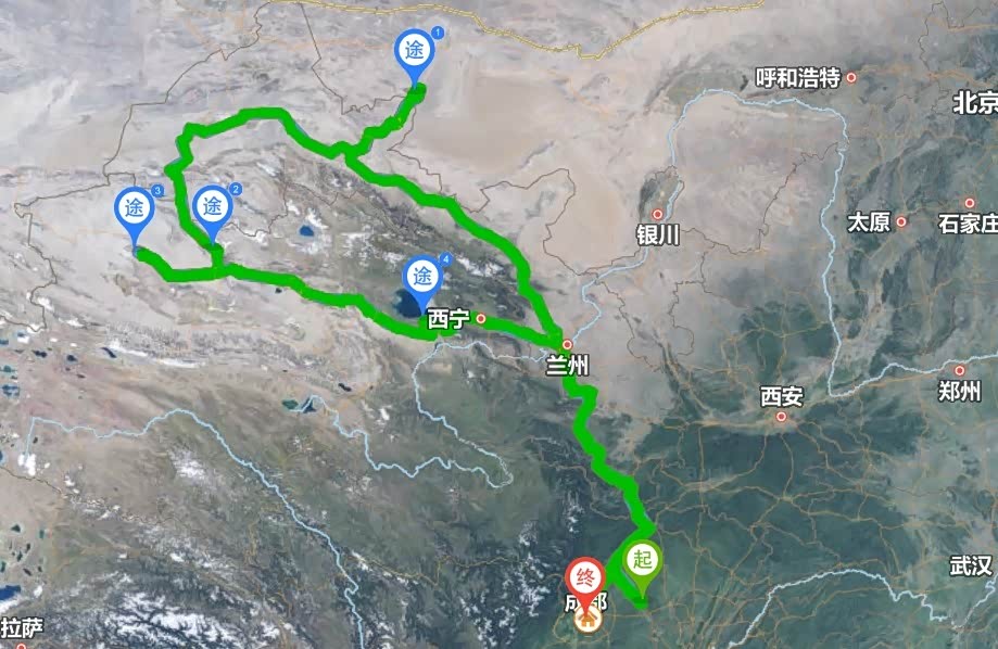 路线 : 射洪 ~ 兰州 ~ 西宁 ~ 祁连山 ~ 张掖七彩丹霞 ~ 酒泉卫星发射基地 ~ 嘉峪关 ~ 榆林窟 ~敦煌莫高窟、鸣沙山月牙泉 ~ 大柴旦 ~ 315U型公路 ~东台吉乃尔湖 ~ 乌苏特水上雅丹 ~ 西台吉乃尔湖 ~ 大柴旦翡翠湖 ~ 青海湖 ~ 西宁 ~ 成都