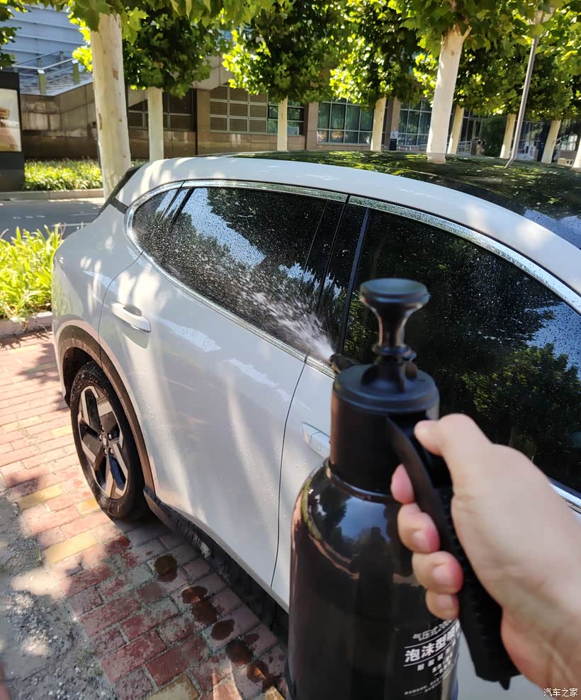 用喷雾水壶将全车都喷上洗车液泡沫,这款洗车液还是挺出泡沫的。