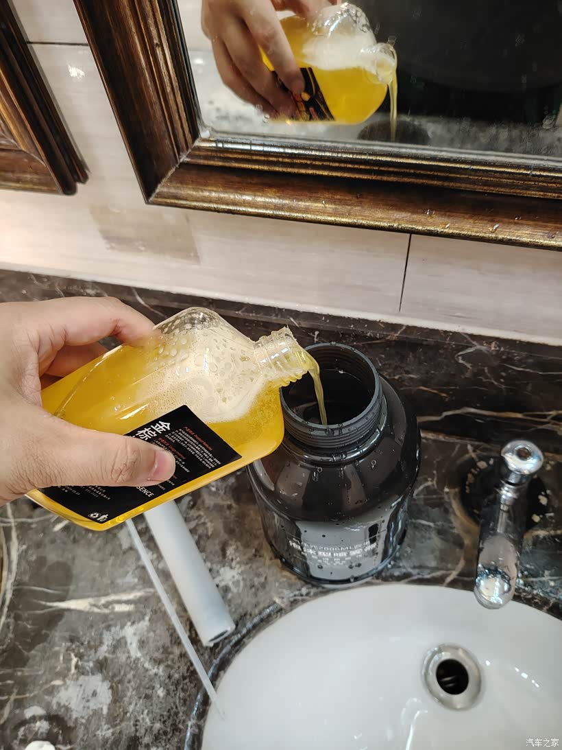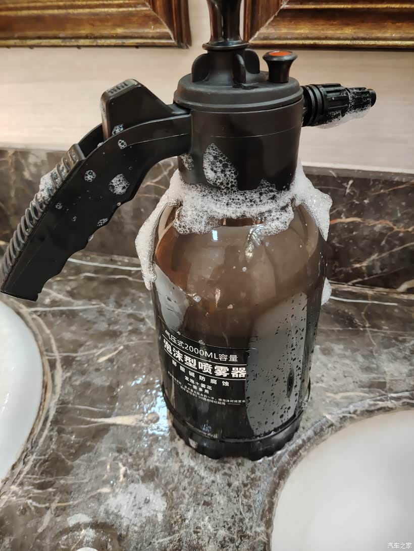 注意事项:按照要求,喷雾水壶的水只需要一半,兑入整瓶洗车液四分之一,出的沫就挺多的,均匀的把洗车液喷到车身上。