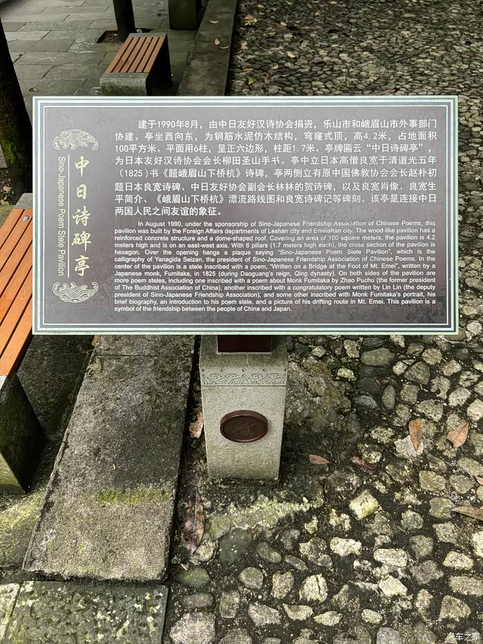 1986年中日友好汉诗协会成立,为了促进两国的友好往来以及文学领域的交流,也为了完成高僧良宽的心愿,1990年才在此投资修建了诗碑亭和亭前的索桥。““中日诗碑亭” 亭额,是日本日中友好汉诗协会会长柳田圣山题写的,亭内有一块黑色石碑,正面镌刻的便是良宽大师的那首《试题峨眉山下桥桩》诗,背面镌刻的则是中国佛教协会会长赵朴初先生唱和良宽和尚的诗文:禅师诗句证桥流,流到宫川古渡头。今日流还一片石,清音长共月轮秋。