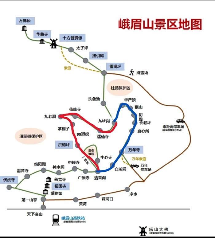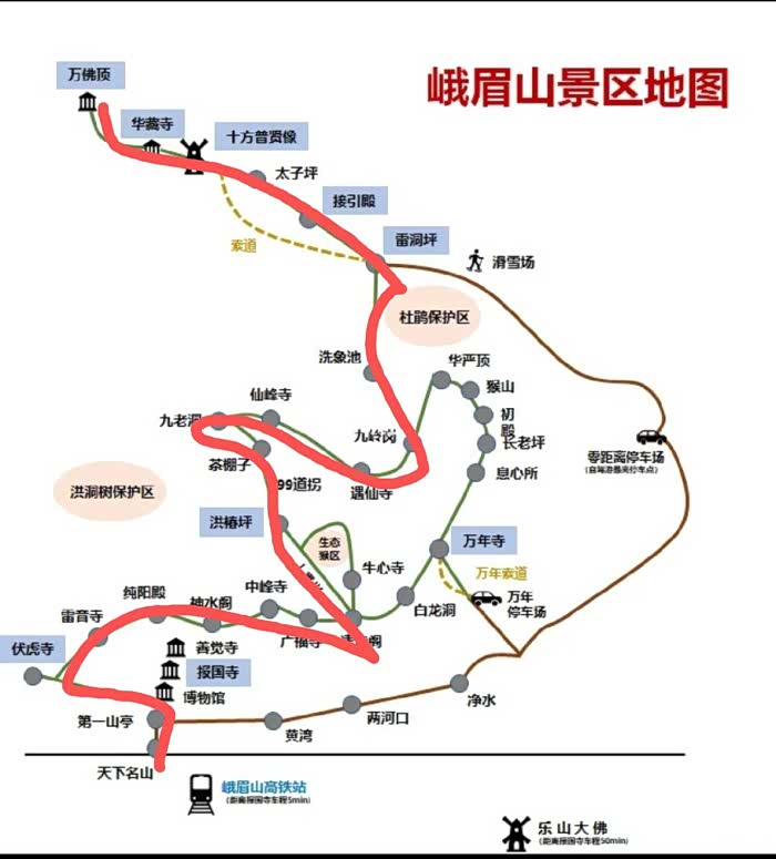 下图红线是我意愿中的徒步下峨眉山的路线。
