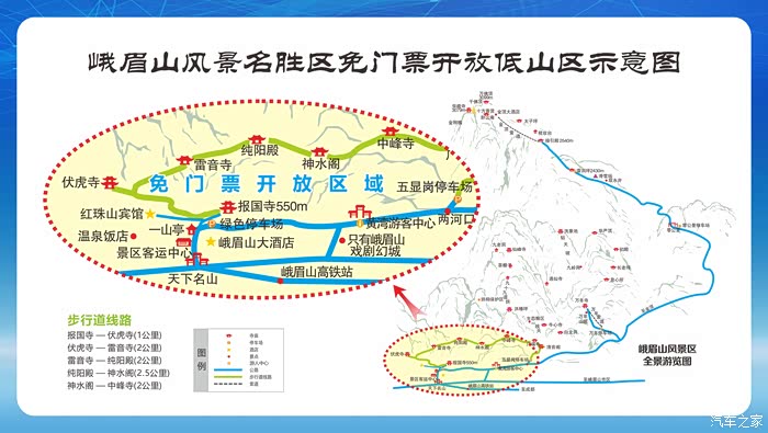 之前我在《老夫老妻不服老,冒雾冒雨爬峨眉》中写徒步爬峨眉山时说过:从严格意义上讲,或者假如要神圣些仪式些,徒步爬峨眉,应从景区路之天下名山牌坊开始,或者应从峨眉山旅游客运中心开始,至少应从第一山亭广场或秀甲天下瀑布开始,且尽量不走公路,走人行步道,才算名副其实。其路线和起点如下图,图中红线,我认为是最经典峨眉山上山路线。有人说,峨眉山起点应该是黄湾乡的起点大牌坊,我不否认它可以算是峨眉山的起点,但不应该是徒步的起点,而是乘车进入的起点,就是外部车辆进入峨眉山的起点。