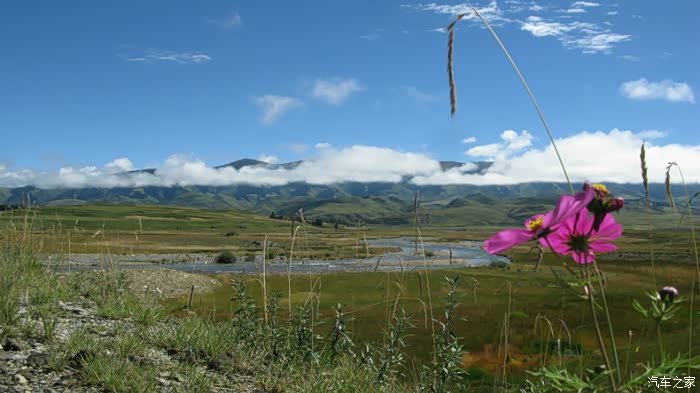近旁的格桑花在原野吹来的微风中摇逸着身姿亲切的微笑