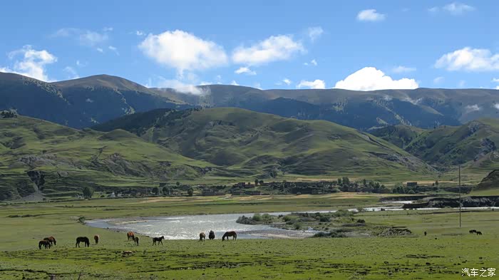 草地青青的牧场上洒落着马儿、牛儿、羊儿……还有那看家的狗儿。
