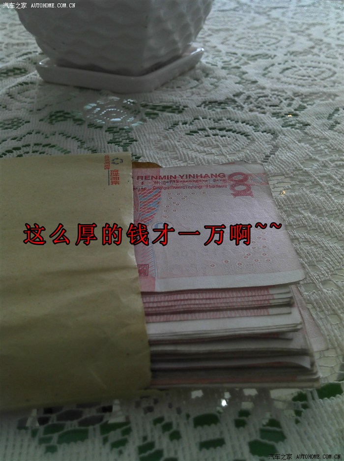 8月30日下定,9月26日就催我提车了。当时忙啊,说国庆放假了去行不?不行。销售是个小姑娘,跟我说尽量在国庆前找个时间去,很快的,我敷衍她,看看吧。郁闷。提车是个大事,我又不懂车,老公经常出差,想等老公回来了才去都不行,虽然老公也不懂车,但两个人商量着总好一点吧。终于在29日晚上我答应销售30日提车。30日我上班去了。领导要开会。交代放假的注意事项,那个会拉得长啊......我跟一位男同事到达4S已经快11点了。我老公中午也回到了。我匆匆看一眼车就去交钱,其他都刷了卡,剩下两万交现金。数钱机一过我傻眼了,这么多钱怎么才一万啊?老公直接给我的没经过别人的手啊,我也没数,真是个没摸过钱的人,这么厚怎么才一万啊。马上十万火急电话老公。老公也迷糊了,他也没数钱!他去想办法。我跟同事就在4S里等。十几万都刷了,唉,还是不够稳重。中午在4S吃的饭,连累了同事。本来提车就请他帮开回家,接着请他吃饭,唉,吃的4S的盒饭。