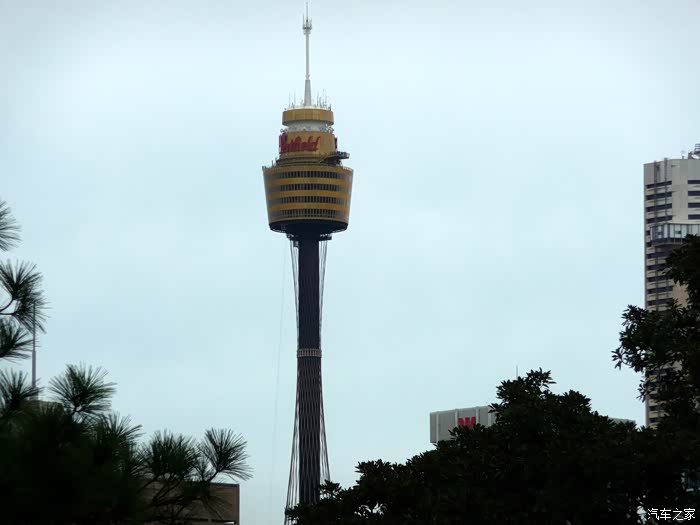 来到悉尼塔下 悉尼塔建成于1981年,高305米,是南半球最高的建筑物。坐落于悉尼市区购物中心的繁华地段,由56根每根重达7吨的巨缆支撑,塔上有圆桶形五层建筑。搭乘需要转换两次电梯,用40秒就能到达观光层。是纵观市区全景的最佳观赏点,它360度的视野,整个悉尼市一览无余。