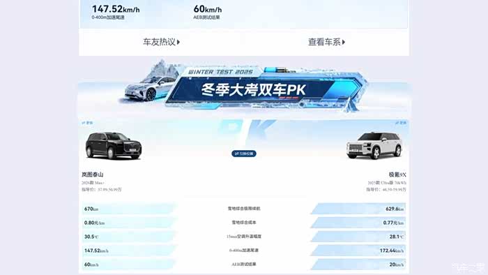 极氪9X的优势就是出得早,泰山虽然是今年底刚出不久,但是我看之家冬测的成绩还可以啊。有个冬季大考双车PK,就是泰山和9X的。雪地综合极限续航泰山有670km,比9X多了40来公里。AEB测试成绩也是顶级,60km/h,极氪9X才20km/h,这个主动安全也很牛皮。然后泰山就是全系标配大电池,这个三百多公里的纯电续航也是一个优势,日常代步多的,纯电续航高一些可以不用经常充电,整体更合适一些吧。如果是二选一的话,结合这个成绩,我这种北方人,选泰山还是更稳一些。