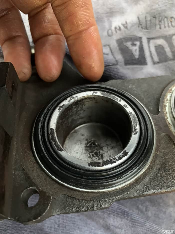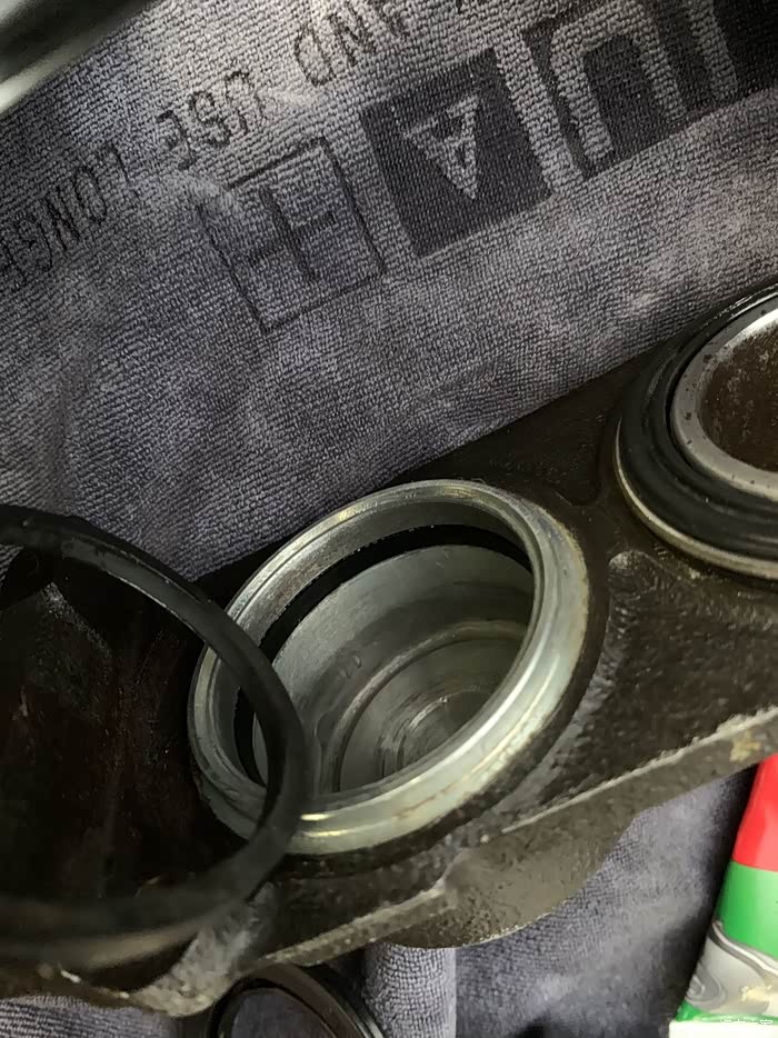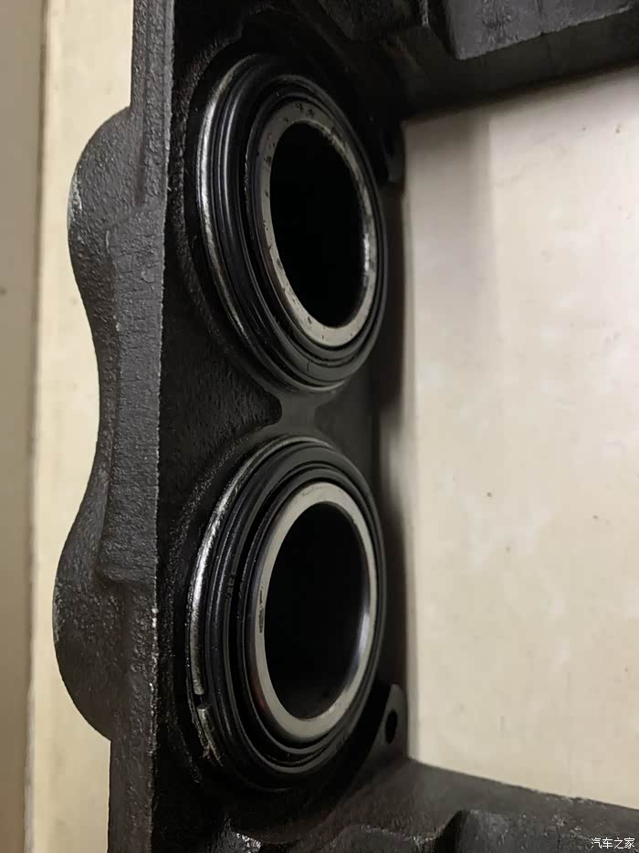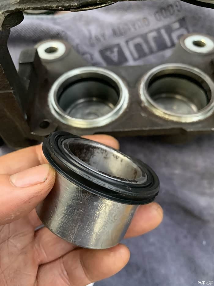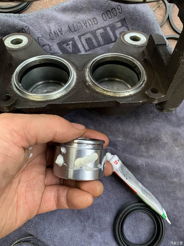 安装买回来的原厂胶圈,先装活塞里面的,发现新的比旧的圈大,这是防刹车油漏出来,质量要好,抹上进口的耐高温硅胶油,一定要硅胶,锂基的润滑油据说会腐蚀胶圈和防尘套,把防尘套里面也抹一点,不多,主要怕不够用,自己用手把活塞压进去