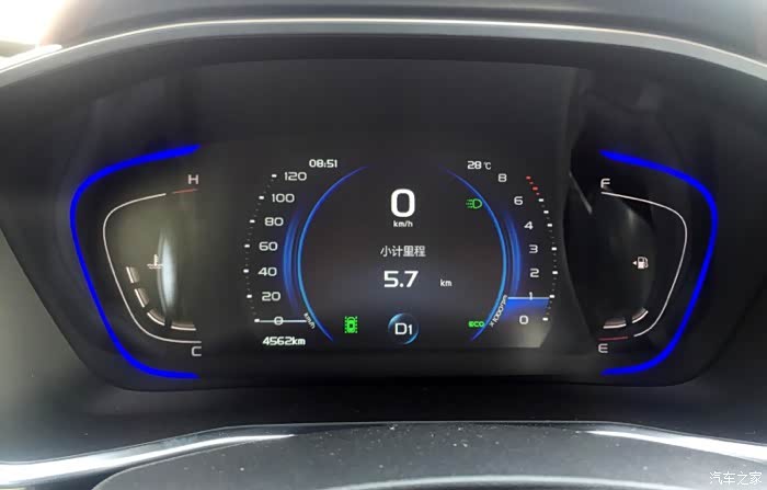 前面讲的都是在日常模式下仪表盘显示的状态,仪表盘有三种显示模式,这是ECO模式下的状态,跟日常模式区别不大,只是颜色变为蓝色